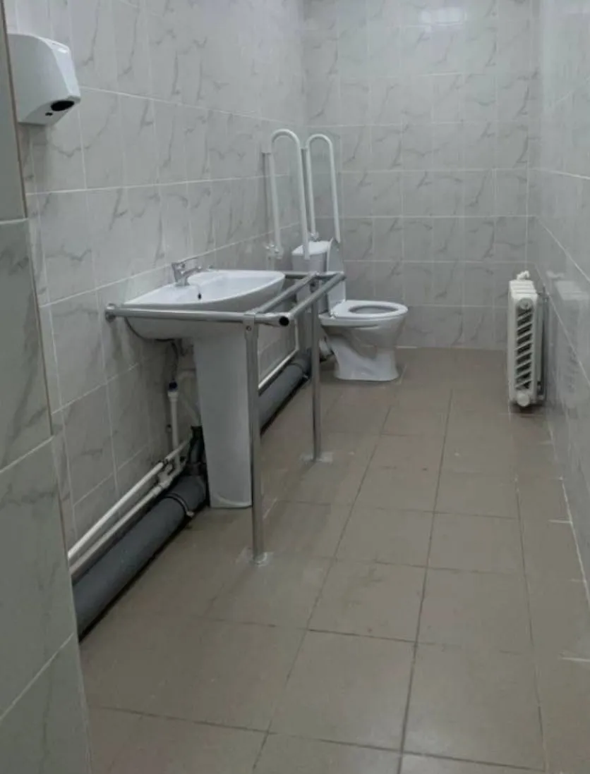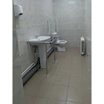Поручень разборный, опорный для раковины, с дополнительной передней опорой для удобства подъезда на коляске, с креплением к полу и стене.
